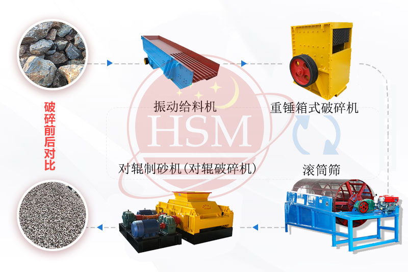 時(shí)產(chǎn)100噸對(duì)輥破碎機(jī)生產(chǎn)線(xiàn)制砂生產(chǎn)流程